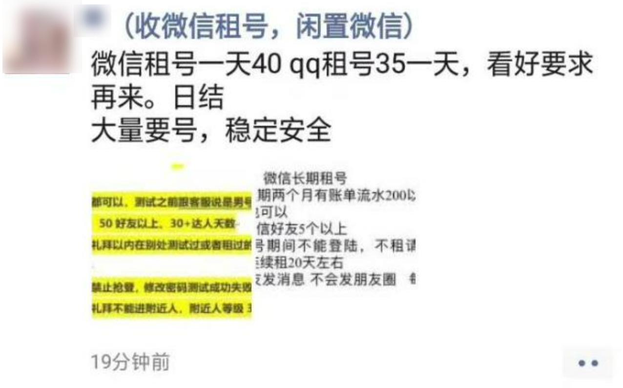 另外,租号的朋友圈也容易被他人用来发布虚假广告,黄赌毒、诈骗等违规信息。