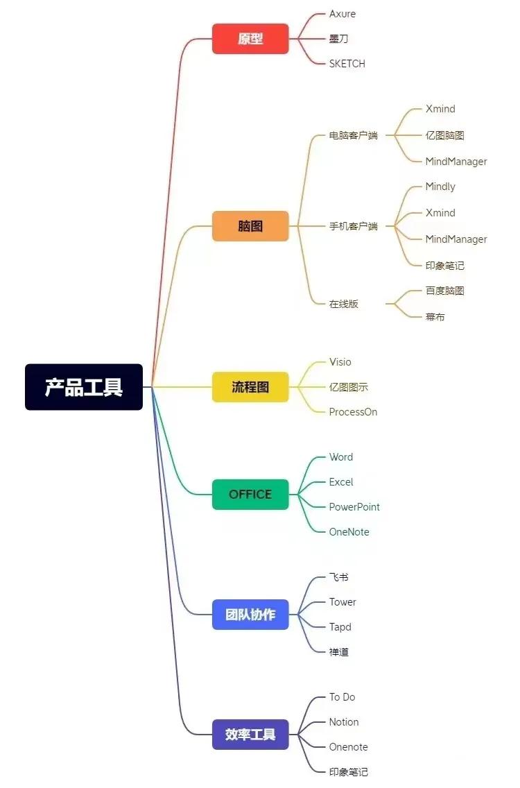 产品经理最重要的工具就是画原型的工具,这个属于产品的必修课,必须要会的!然后是脑图,产品经理通常喜欢用脑图去梳理自己的思路,因为脑图的建立有利于人们对其思考的问题进行全方位和系统的描述与分析。再然后是流程图,因为开发基本都是强逻辑型的思考方式,相对于你的文档他们更喜欢去看你绘制的流程图,将业务、信息流的流转通过一个图去体现。在剩下的就是一些office的功底,团队协同的工具(每家公司都会有自己的协同工具,虽然不同但是功能大同小异),效率工具:这个主要是为了让你可以更好的管理你自己的时间,因为产品经理会有很多的会议,会有很多的杂事,那你可以通过这些效率去规划你的时间。