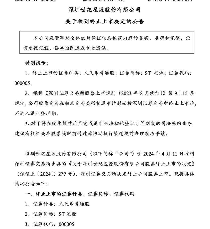 4月11日晚,世纪星源再发公告称,公司于2024年4月11日收到深圳证券交易所出具的《关于深圳世纪星源股份有限公司股票终止上市的决定》,深圳证券交易所决定终止公司股票上市。退市理由是在2024年1月30日至2024年3月5日期间,公司股价连续二十个交易日的每日收盘价均低于1元,触及了相关规定中终止上市的情形。