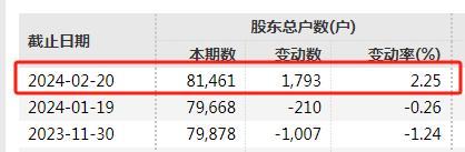股东户数上,Wind数据显示,截至2024年2月20日,该公司股东总户数为8.1万户。