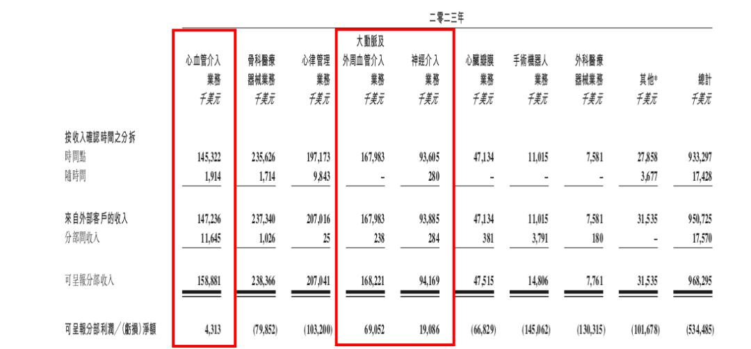 根据微创医疗2023年财报,截至2023年末,公司仅有三项业务能够盈利,其中大动脉及外周血管介入净利润0.69亿美元,神经介入(脑出血、缺血、通路产品)为0.19亿美元,而心血管介入(主要为冠脉支架产品)则刚刚扭亏为盈,实现净利润0.04亿美元。