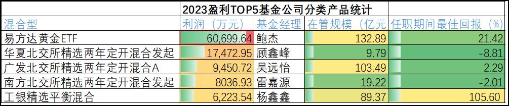 混合型基金是近几年熊市的重灾区,TOP5公司中最赚钱的产品分别是:易方达黄金ETF,华夏北交所精选两年定开混合发起式,南方北交所精选两年定开混合发起,广发北交所精选两年定开混合A,工银精选平衡混合。