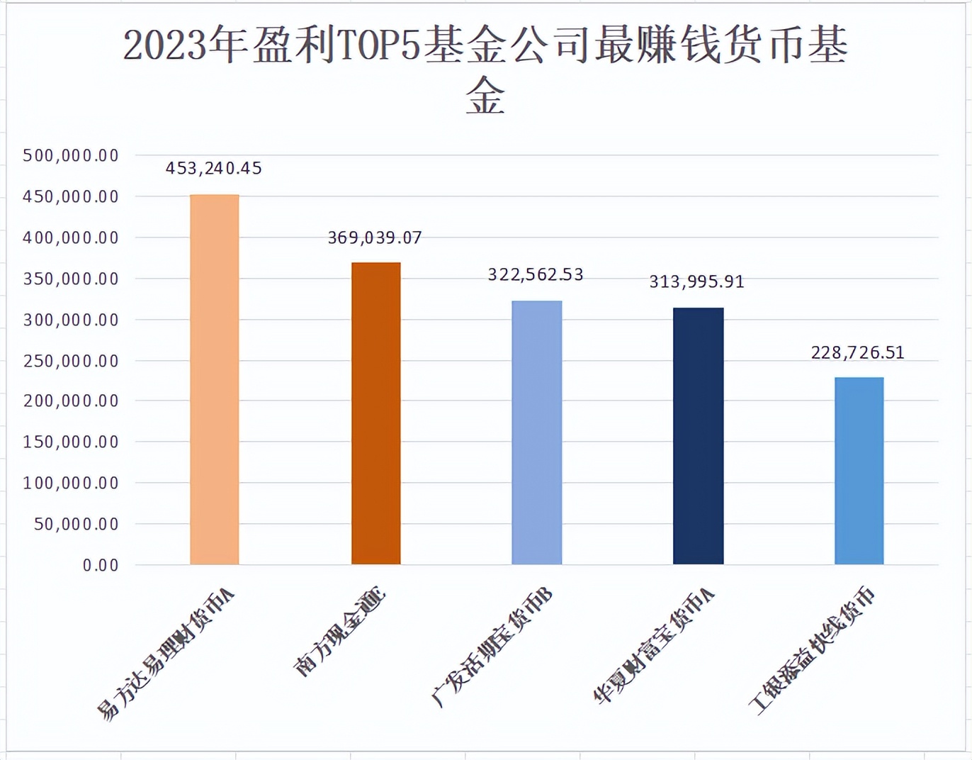 TOP5公司货币型基金投资成绩更好,各家最赚钱的产品,盈利都在20亿以上,分别是:易方达易理财货币A,华夏财富宝货币A,南方现金通E,广发活期宝货币B,工银添益快线货币。