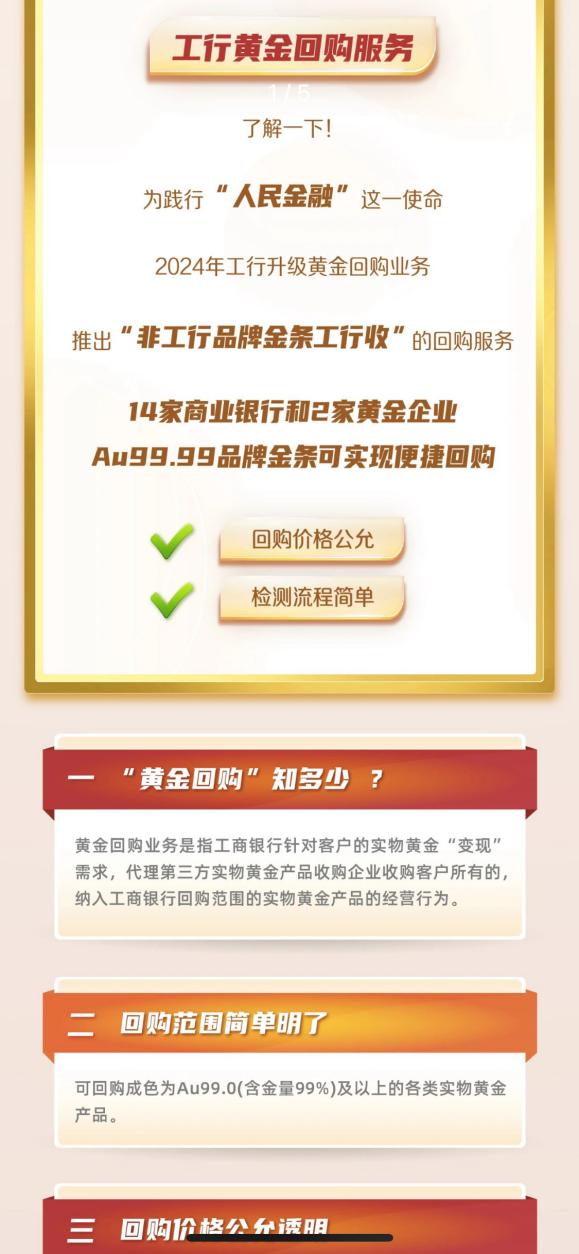 具体来看,工行官微发文表示,其在2024年升级了黄金回购业务,推出“非工行品牌金条工行收”的回购服务,范围包括14家商业银行和2家黄金企业。