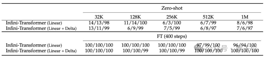 实验结果显示,即使在输入只有5K进行微调的情况下,Infini-Transformer可成功搞定1M长度(100万)的passkey检索任务。