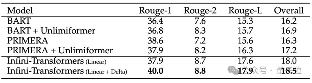 在处理长达500K长度的书籍摘要任务时,Infini-Transformer达到最新SOTA。