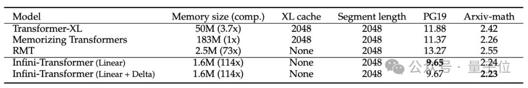 在长下文语言建模任务中,Infini-attention在保持低内存占用的同时,困惑度更低。