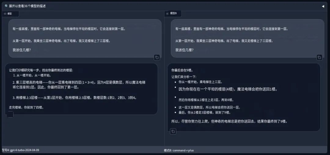 比如一道乘电梯的推理题。陷阱在于这部神奇电梯无论坐几层,最后都会停在一层。GPT-4 Turbo理解了这层逻辑,最后给出了正确答案。