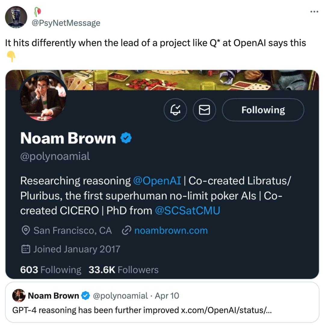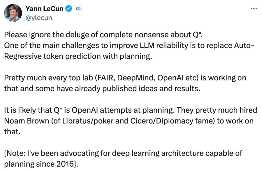 德扑AI之父、前FAIR(Meta)研究科学家Noam Brown也被视为是Q*项目的重要成员(推测来自LeCun)。