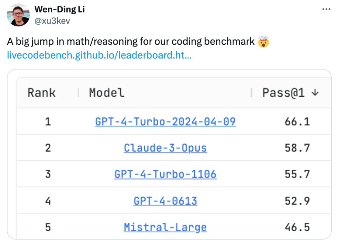 Noam Brown也发推表示新版GPT-4 Turbo在推理能力上大幅提升——要知道,这位OpenAI科学家一直被外界认为正在研究Q*。