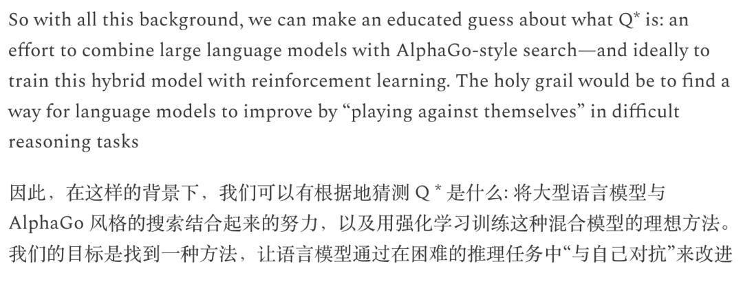 他加入OpenAI的动作也被外界视为分析Q*的一个线索,“有理由怀疑Q是将LLM和AlphaGo结合起来,并用强化学习进行训练”。