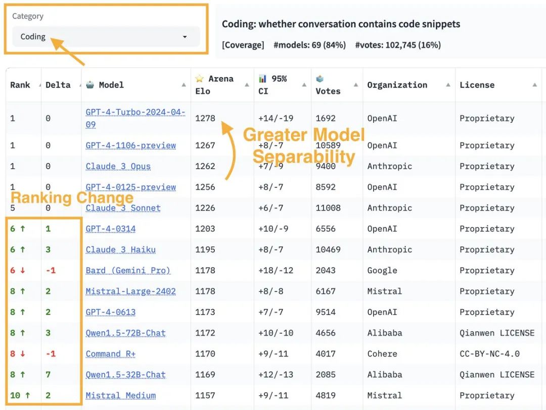 竞技场的结果表明,在代码能力方面,GPT-4 Turbo也更强了。