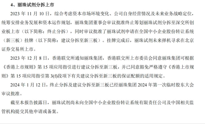 2020年10月23日,丽珠集团董事会通过了分拆丽珠试剂至深交所创业板上市的议案。2023年11月,丽珠试剂拟分拆至深交所创业板上市的计划宣告终止。而丽珠试剂在创业板IPO折戟后,也将目标转换至新三板。
