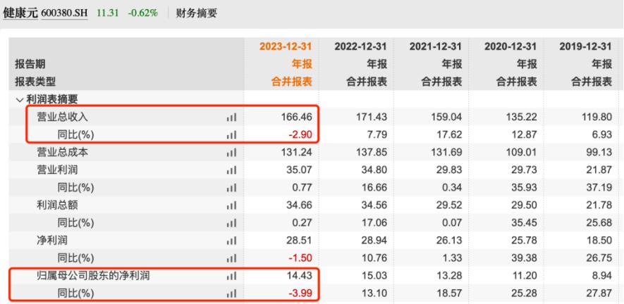 年报显示,2023年,健康元实现营业收入166.46亿元,同比下滑2.90%;归母净利润14.43亿元,同比下滑3.99%。这是自2019年以来,健康元首次出现业绩下滑。