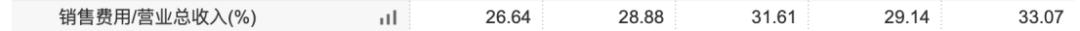 此外,2019年-2023年,健康元销售费用占营业总收入的比例(即:销售费用率)分别为33.07%、29.14%、31.61%、28.88%和26.64%。