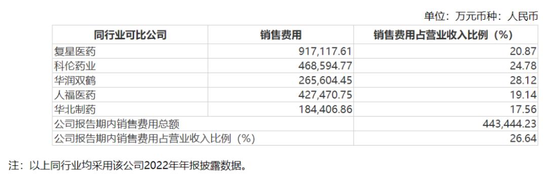 财报显示,2023年,健康元的销售费用率高于同行公司复星医药、科伦药业、人福医药以及华北制药,仅低于华润双鹤的28.12%(注:以上同行业均采用该公司2022年年报披露数据)。