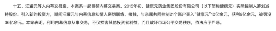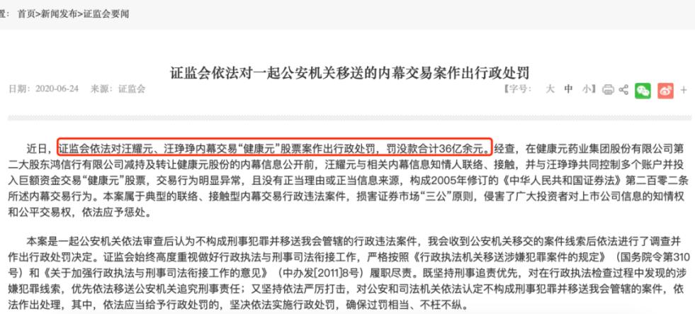 2020年6月,证监会依法对汪耀元、汪琤琤内幕交易“健康元”股票案作出行政处罚,罚没款合计36亿余元。