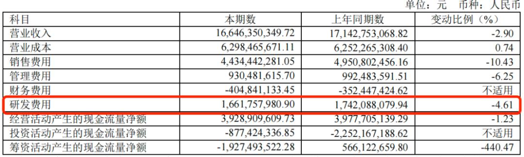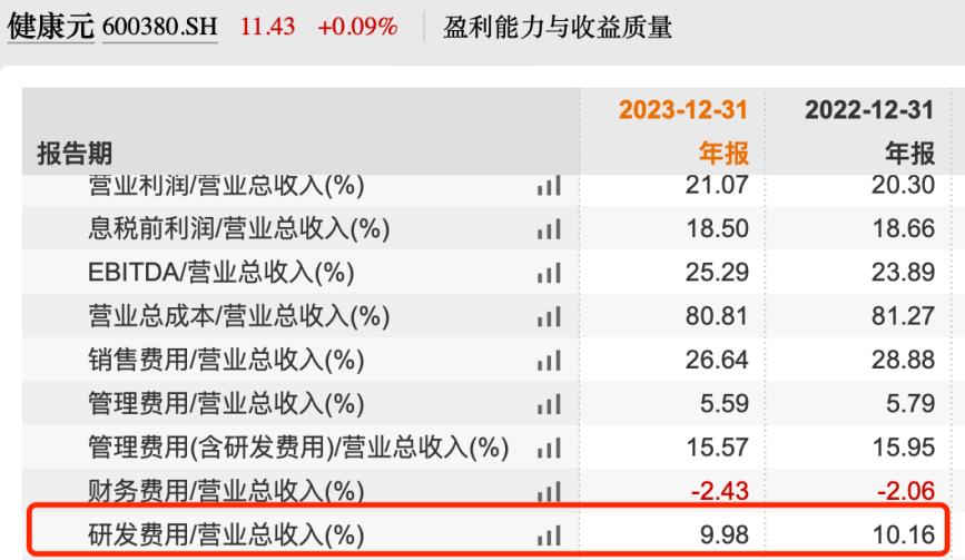 值得一提的是,2023年,健康元的研发费用为16.62亿元,较2022年的17.42亿元下滑了4.61%。此外,2023年,公司研发费用占营业收入的比例为9.98%,较2022年下降了0.18个百分点。