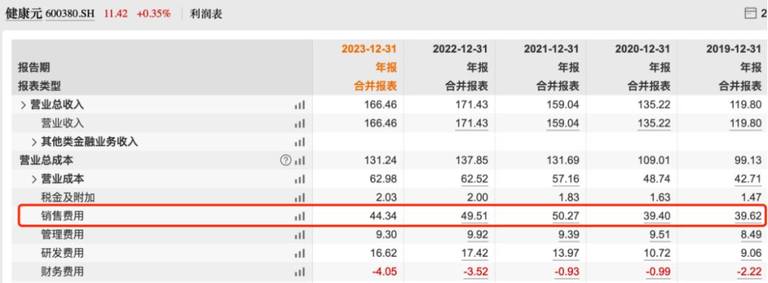 Wind数据显示,2019年-2023年,健康元的销售费用分别为39.62亿元、39.40亿元、50.27亿元、49.51亿元和44.34亿元,自2022年开始销售费用有所下降,但仍然处在高位。