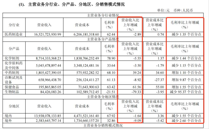 此外,化学制剂和化学原料药及中间体的毛利率也分别下滑1.44个百分点、1.15个百分点。
