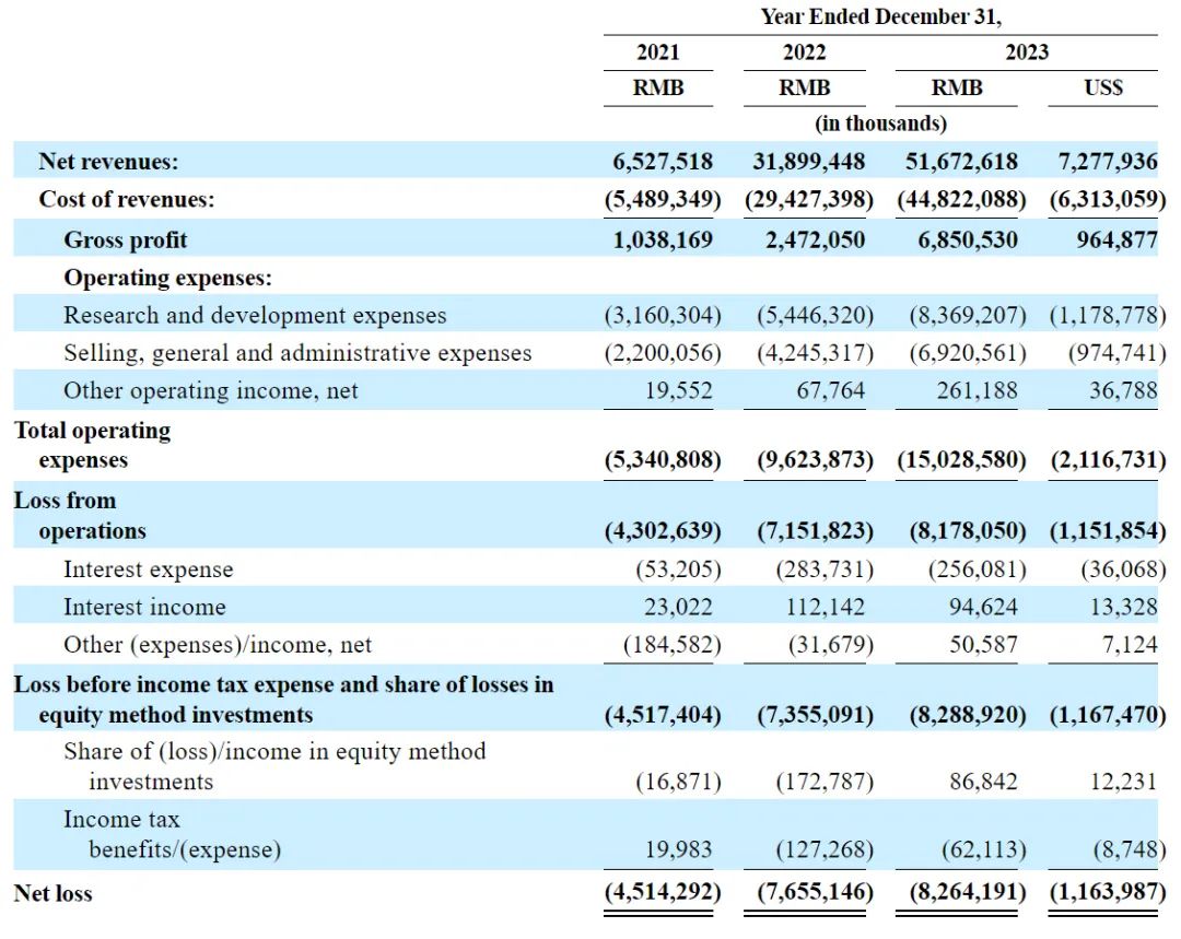 极氪2021年、2022年、2023年运营亏损分别为43亿元、71.52亿元、81.78亿元(约11.52亿美元);净亏损分别为45.14亿元、76.55亿元、82.64亿元(约11.64亿美元)。