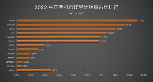 2023 年,国内手机市场战报早已出炉, 我们可以看到,此前同为“ other ”的三星已经涨到了 0.9% 。