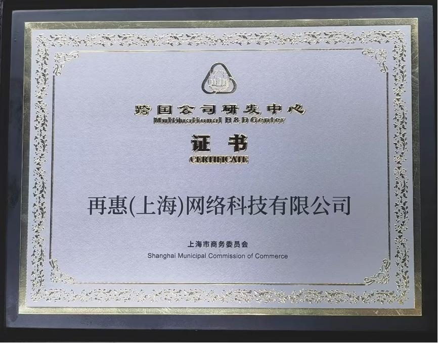 再惠科技获批上海市商务委员会正式认定的上海市外资研发中心,并获上海市市长龚正颁证。