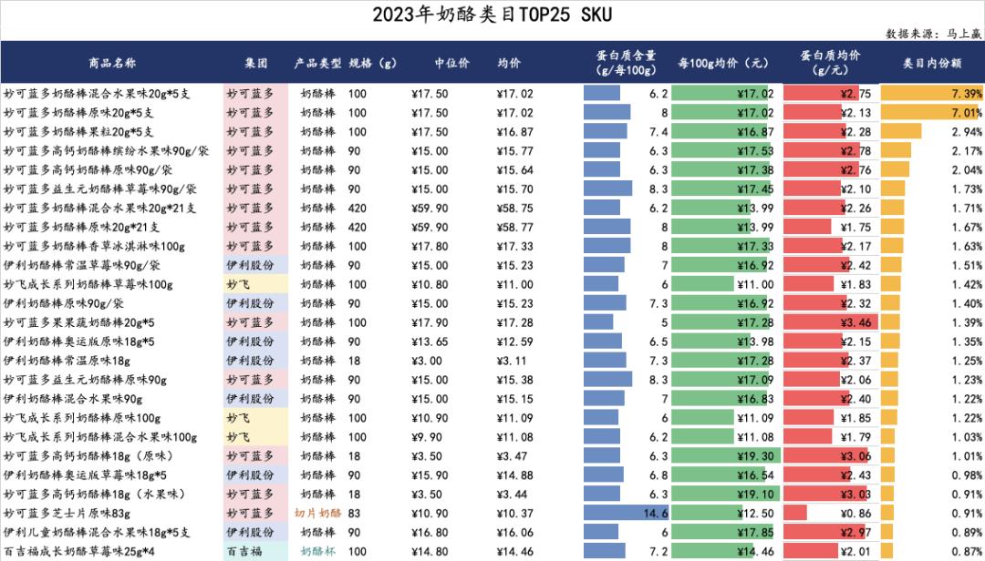 在2023年销售TOP25的奶酪类目产品中,奶酪棒绝对是“顶流”——除了一款妙可蓝多的芝士片和一款百吉福的奶酪杯以外,其他都是各式各样的奶酪棒。妙可蓝多共有14款产品上榜,其次是伊利(7款)、妙飞(3款)、百吉福(1款)。
