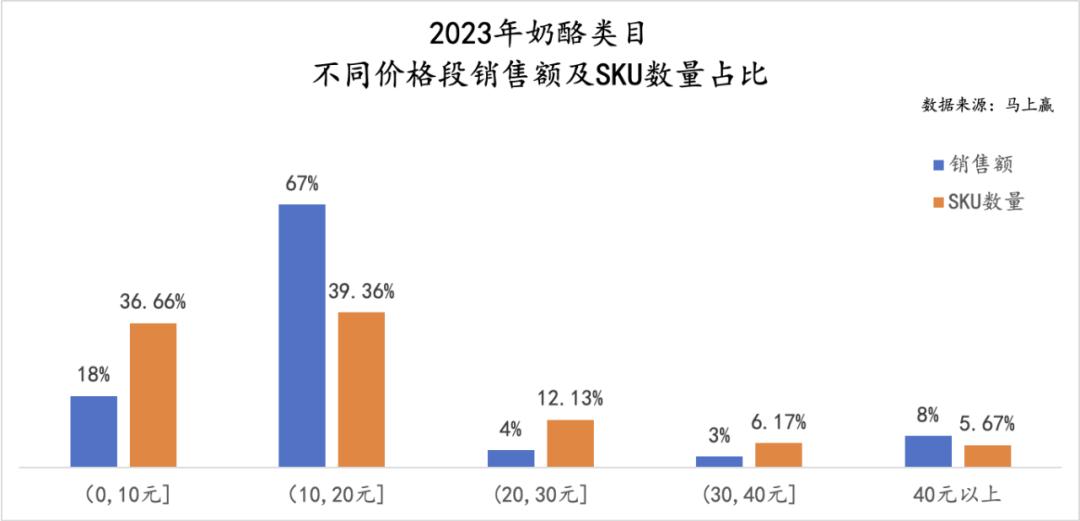 观察奶酪产品的价格带,20元及以下产品SKU数量占比超过75%,同时贡献了85%的销售额。除此以外,值得注意的是40元以上产品SKU占比为5.67%但是贡献了8%的销售额,这有可能来自于“小而美”的高端奶酪产品,也有可能来自于容量更大、单价更低的奶酪棒产品。相比来说,在20~40元这一价格带内,虽然存在将近20%的SKU,但实际的销售额占比较低,这一价格带似乎已经超过了消费者对于品类的价格心智范围。