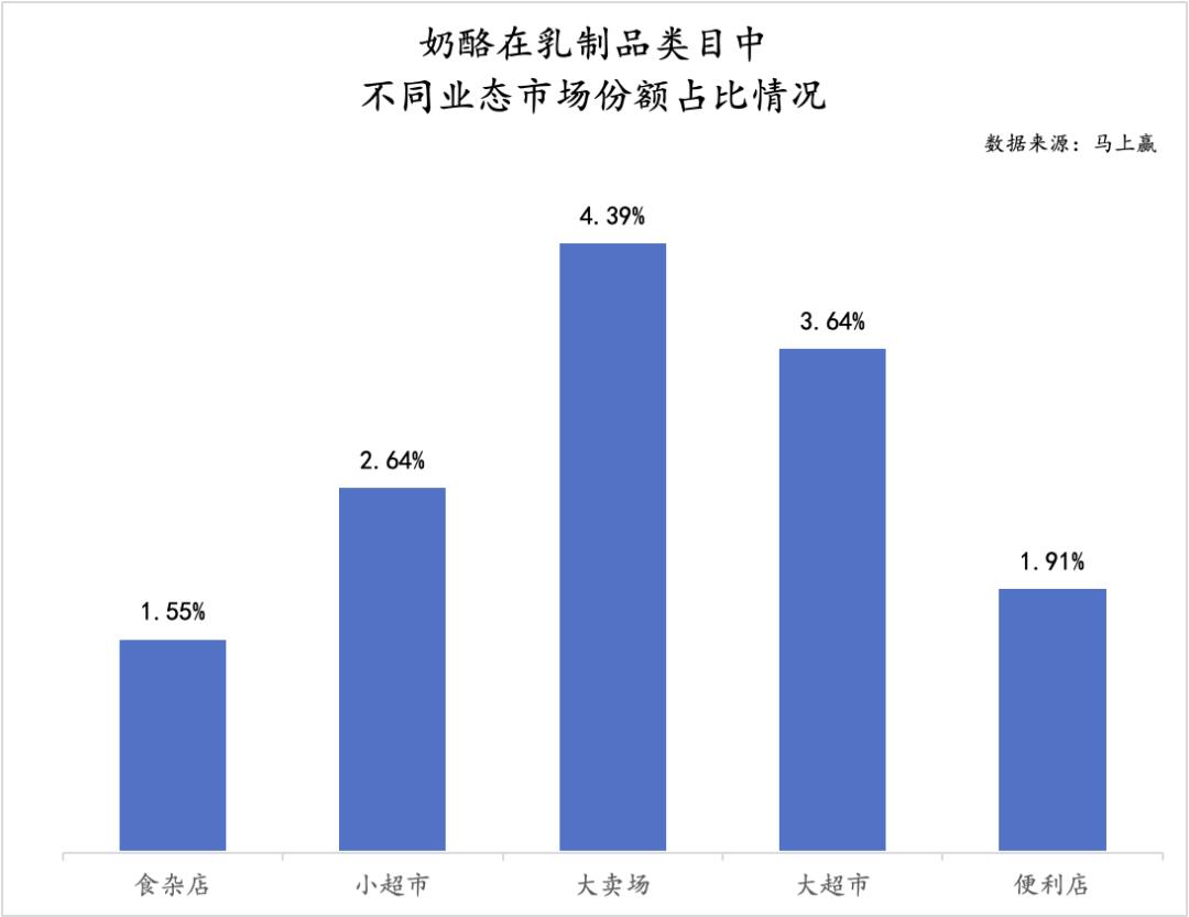在业态表现上,奶酪在不同销售业态的占比表现出了比较显著的差异。可以看到,大卖场、大超市等大业态对于奶酪在乳制品中的销售占比显著高于小业态,这或许也与消费场景相关,大业态会包含更多的家庭采购,奶酪则常在家庭采购中出现。相比小业态则以个人即时消费更多,该场景下奶酪的消费占比较少。