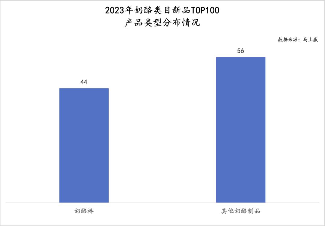 除此以外,在奶酪类目2023年TOP100新品的产品类型分布上,奶酪棒也是大热门,—共有44款产品上榜,是市场上最受欢迎的奶酪新品类型;其他奶酪制品新品达到56款,虽然高于奶酪棒,但其中包含了多种形态的奶酪产品,包括切片奶酪、涂抹奶酪、杯装奶酪等形态,也包括布拉塔奶酪、蓝纹芝士、马苏里拉芝士等细分奶酪品类,表明企业也在推出更加多元的奶酪制品满足消费者的需求。