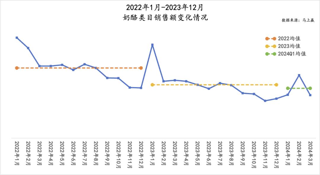 基于马上赢线下零售监测网络中的数据,从2022年1月至今,奶酪类目的整体销售额呈现较明显的阶梯性下滑趋势。从销售均值来看,2022年、2023年以及刚刚过去的2024年第一季度,均值均在下降通道中。即便在2023年1月和2024年2月两个春节月中销售出现了明显的上升,但是整体下落趋势不变。