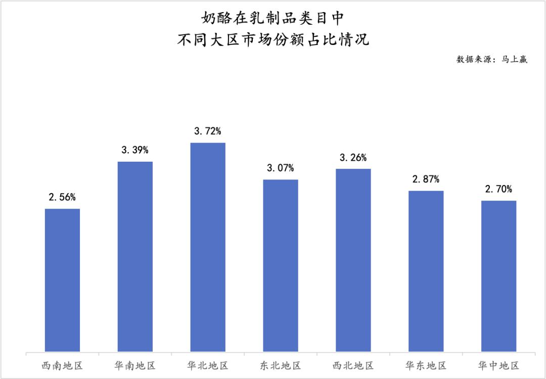 观察奶酪在乳制品类目中不同大区市场份额占比情况,华北、华南地区略高,西南地区相对较低;但是整体而言,地区上并没有显著差别,奶酪在乳制品中的消费份额与经济发展水平的相关性并不强。