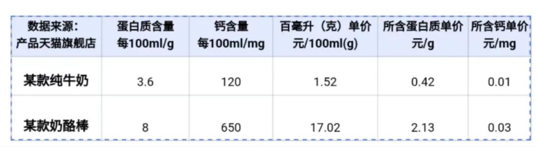 对比奶酪棒和纯牛奶的营养元素,我们发现:从奶酪棒中获取蛋白质和钙,性价比并不高。更何况,奶酪棒里的蛋白质和钙来源,并不一定全部来自于干酪,也有可能是添加的浓缩乳清蛋白、磷酸三钙。