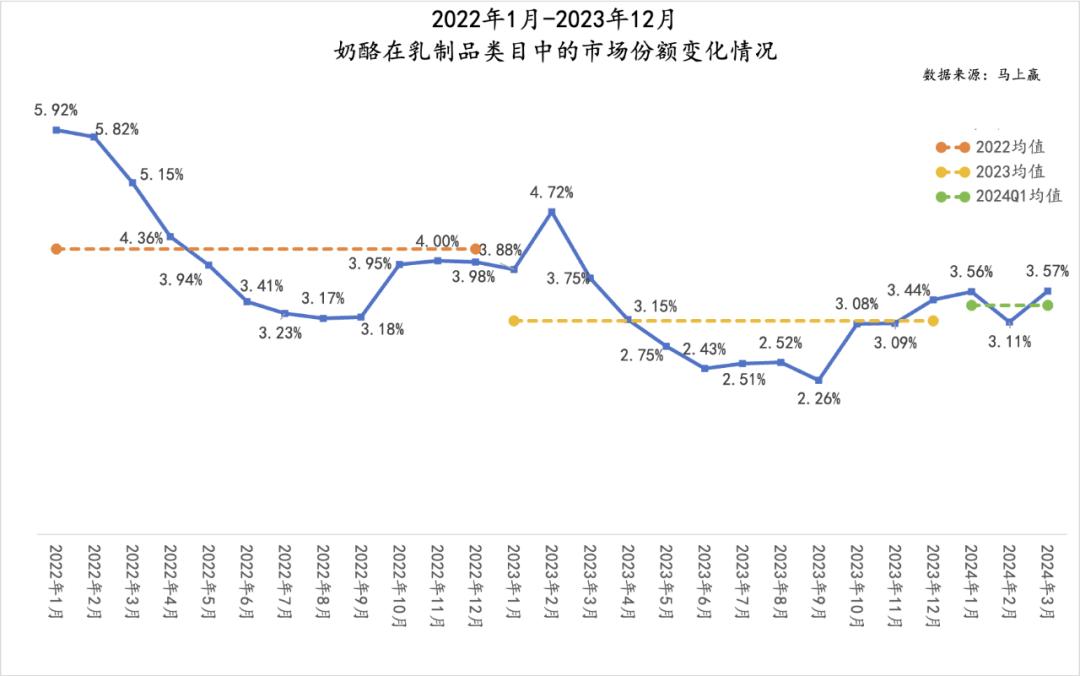 结合奶酪在乳制品类目中的市场份额变化,奶酪类目面对的情况或许更加严峻:奶酪在乳制品类目中的市场份额占比从2022年1月的最高点5.92%滑落至2024年第一季度的3.5%左右,下滑幅度约为40%。