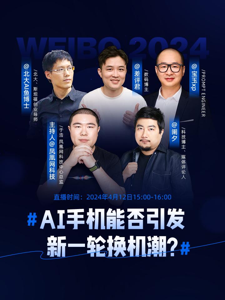 2024年,会是AI手机元年吗?4月12日下午,凤凰网科技中心总监于浩连线科技博主、媒体评论人阑夕,Prompt Engineer宝玉,北大、斯坦福创业导师鱼博士、数码博主差评君4位嘉宾,一起聊聊AI手机会能给“手机党“们5G冲浪带来一座怎样的“鲁滨逊之岛”?本期《凤凰V现场》直播在微博平台吸引了超过80万的观众,被微博平台开屏广告推荐,相关话题参与讨论人数超过100万人。