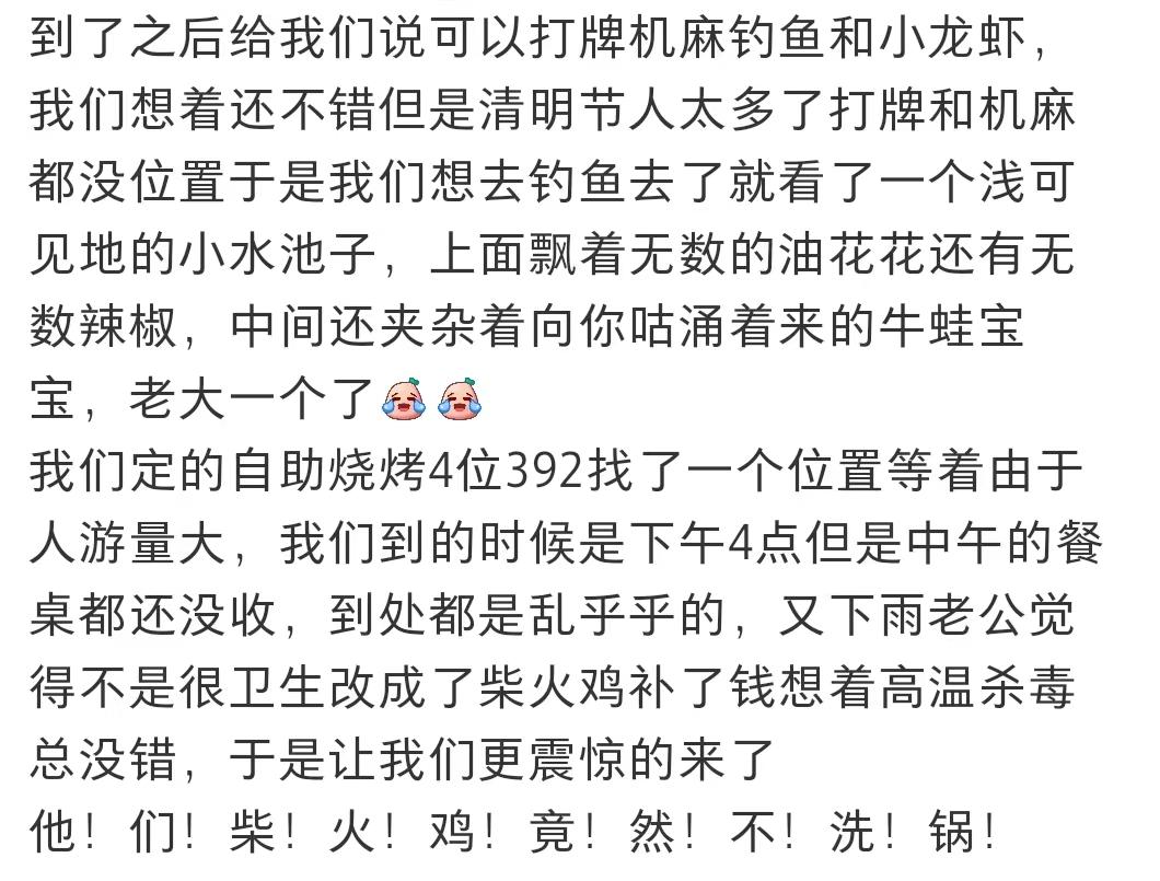 不仅场景体验千篇一律,还有人吐槽,有农家乐所谓的钓鱼体验,就是个小水池子,上菜前更是连锅都不洗。花了5000多块的体验,连几百块的餐馆都比不上。