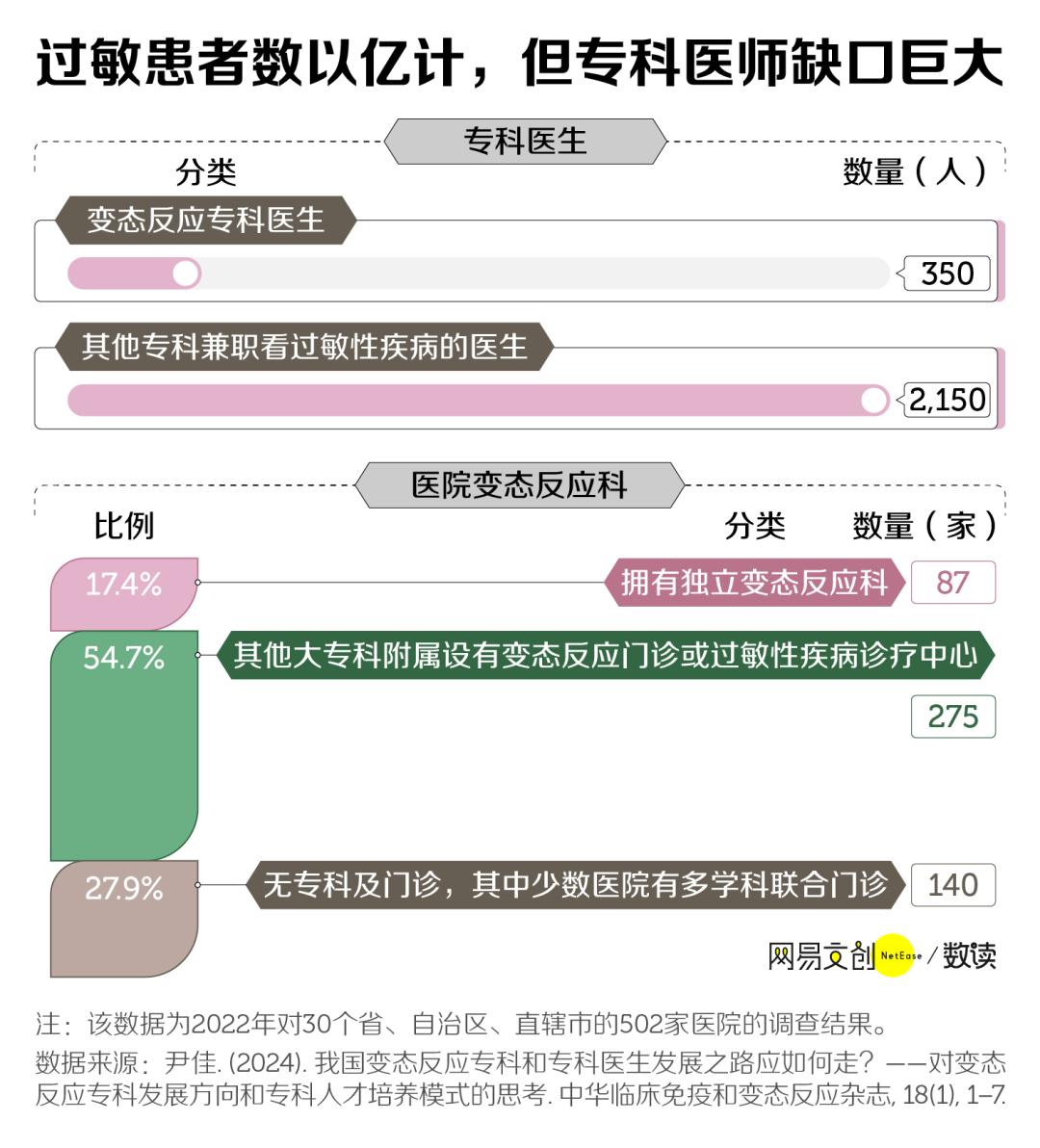 但依据 2022 年的调查数据,中国变态反应专科医生和普通人群的比例是 1:400 万,开设独立的过敏专科的医院仅占调研数据的 17.4%,远不能满足过敏患者的就医需求 [11]。