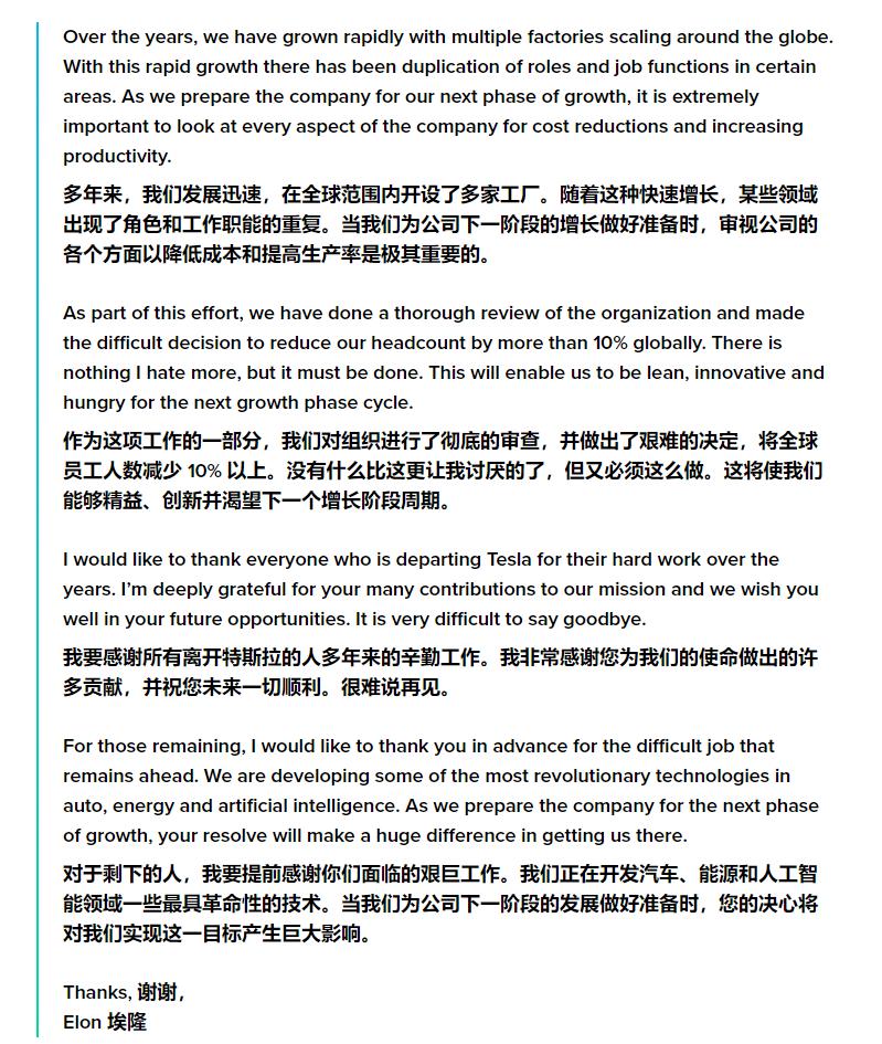但从其他车企的情况来看,小通知道这并非常态。真正的常态可能要看特斯拉:4月15日下午,官方宣布全球裁员10%,总人数或达到1.4万人。据凤凰网科技报道,马斯克发出内部信讲述裁员缘由,包括削减重复岗位、降低成本和提升生产力等。