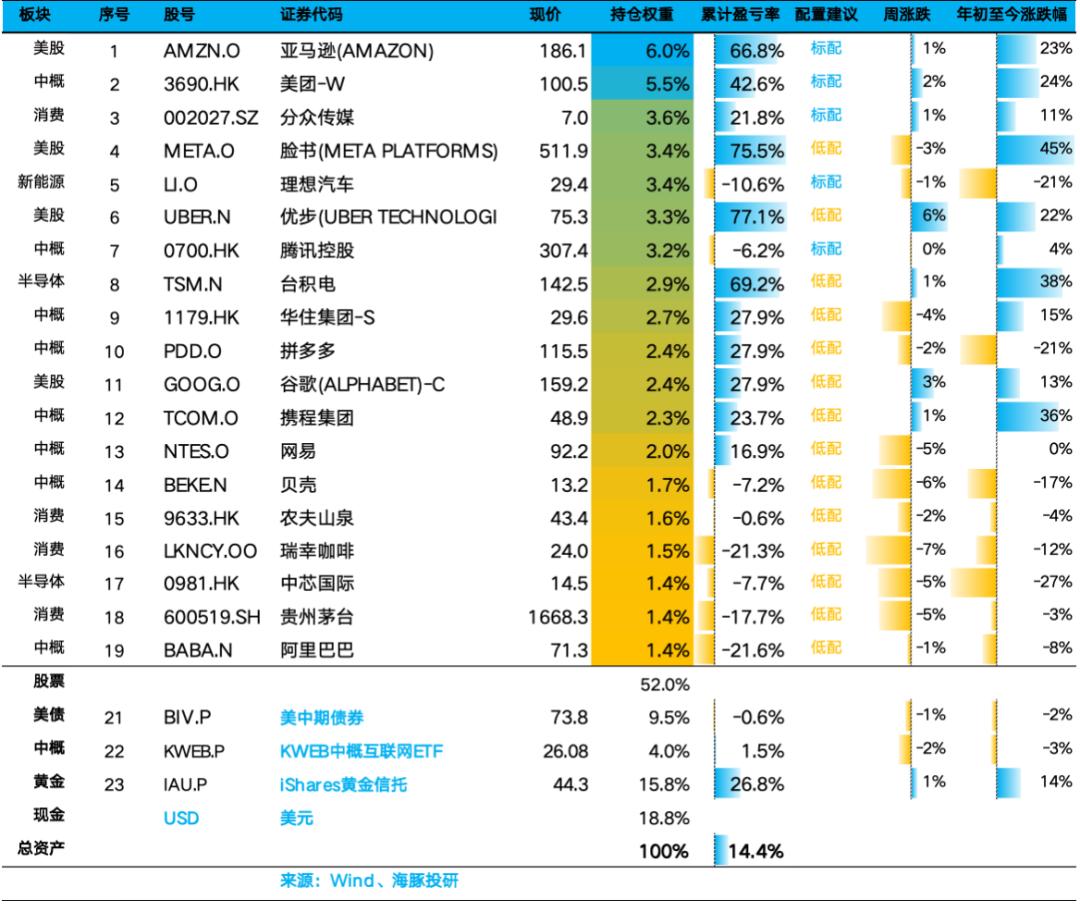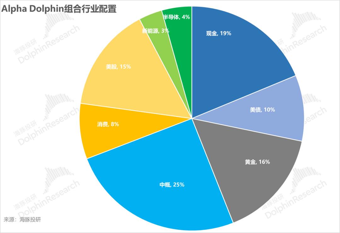 Alpha Dolphin虚拟组合共计持仓20只个股与权益型ETF,其中标配6只,其余权益资产为低配,剩余为黄金和美债和美元现金。
