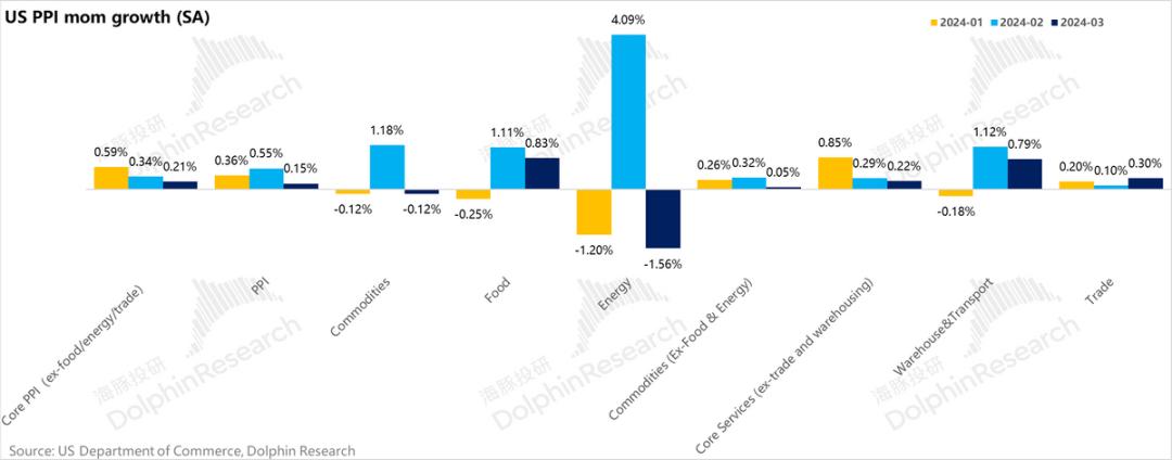 另外商品通胀上,3月的PPI也是一个令人安慰的信号:剔食品和能源的大宗商品PPI作为商品生产的原材料,涨幅微弱;同时剔贸易和仓储的核心服务PPI涨幅也有缩窄,如果是这个趋势,等于说没有PPI的再通胀,也不会有后续的PPI通胀向CPI传导的压力。