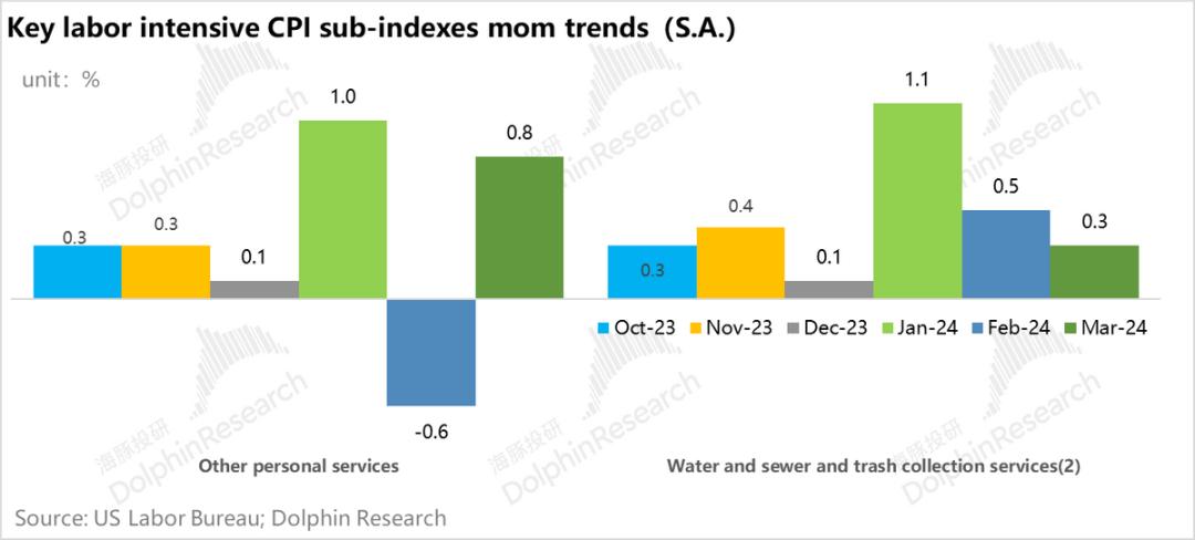 而在海豚君关注强人力投入性核心服务上并没有观察到非常清晰的二次通胀趋势,而再考虑3月30万+的高就业,主要是通过供给侧的改善(参与率上升),而时薪环增0.35%,仍然相对可控,服务通胀看起来不像是单一人力通胀带来的二次通胀。