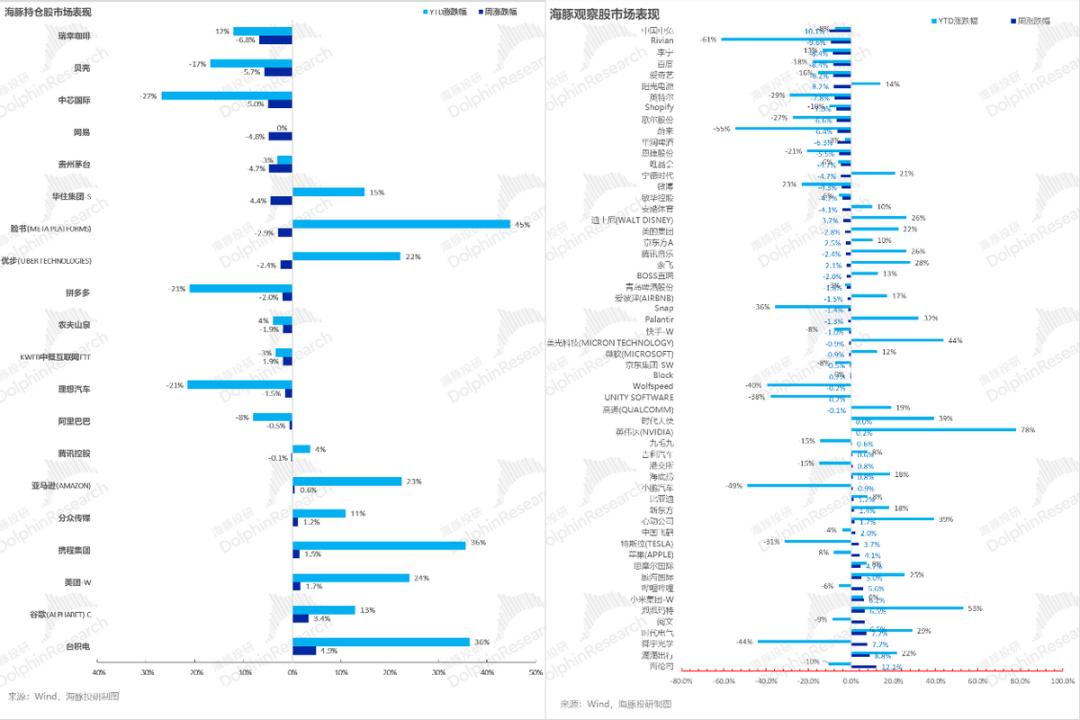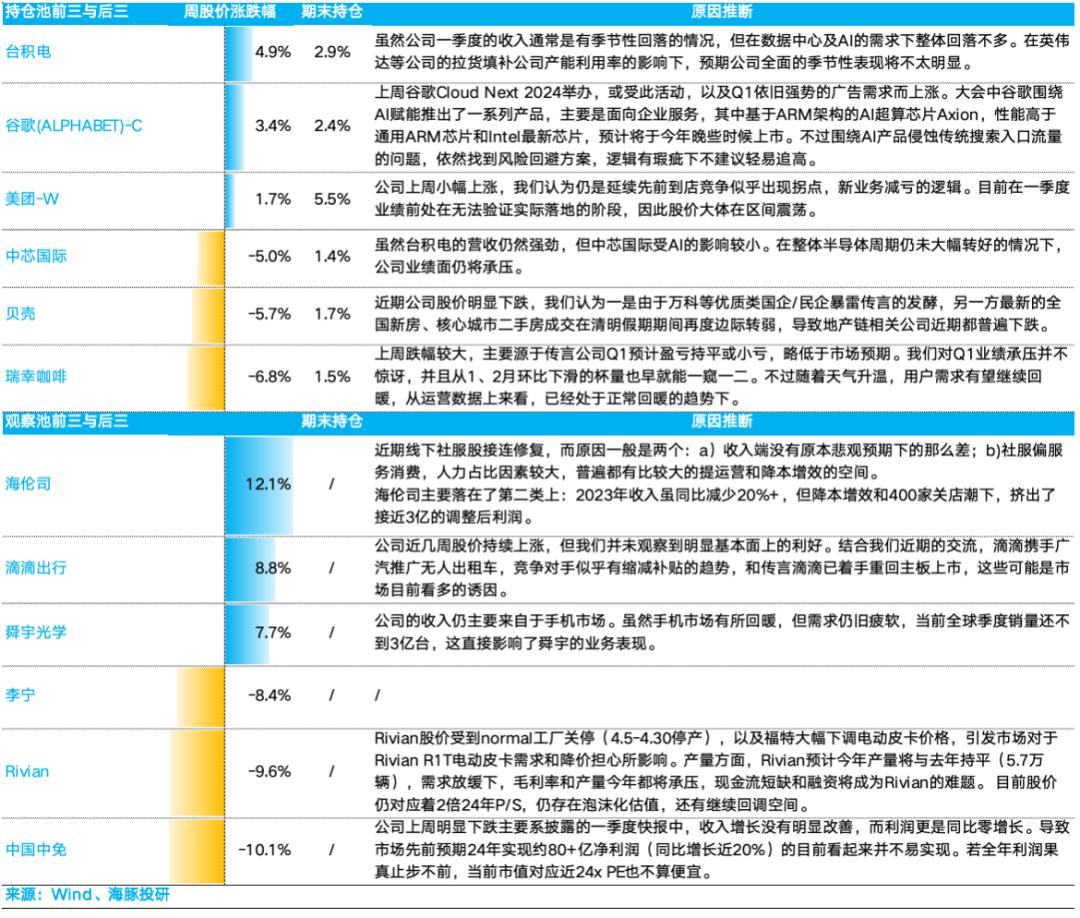 对于海豚君持仓池和关注池中,上周主要涨、跌幅比较大的公司以及可能原因,海豚君分析如下: