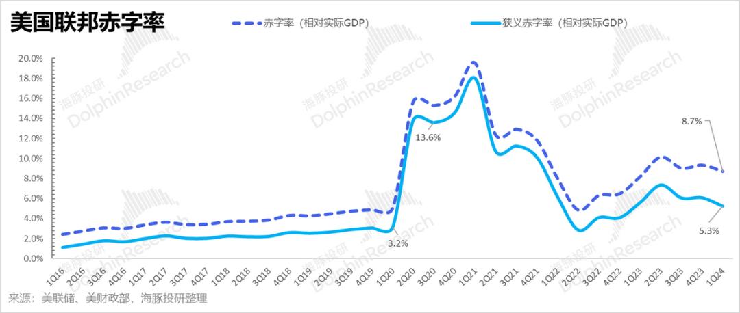 这样,最终赤字的同比减少额也不是1430亿,而是690亿。而2024年三个月下来,总体赤字是5550亿美金,狭义赤字是3400亿美金,美国的财政赤字相比去年同期,整体是在收敛状态。