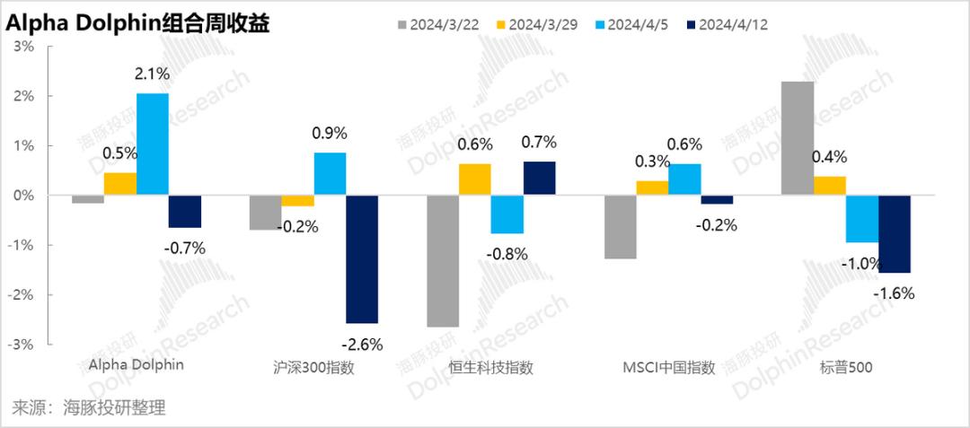 4月12日周,Alpha Dolphin虚拟组合无调仓。当周结束,组合收益收跌0.65%,弱于恒生科技(+0.7%)与MSCI中国(-0.2%),但强于标普500(-1.6%)与沪深300(-2.6%)。