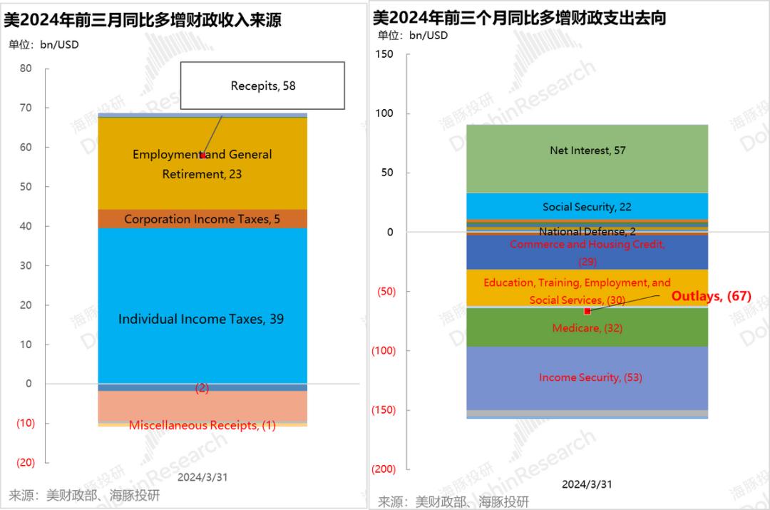 1)3月赤字:2023年疯狂拉高的财政赤字,到了今年3月,在个人财富在资产升值带动下,收入终于拉上来了。2024年三个月下来总赤字是5550亿美金,狭义赤字是3400亿美金,美国的财政赤字相比去年同期整体收敛。
