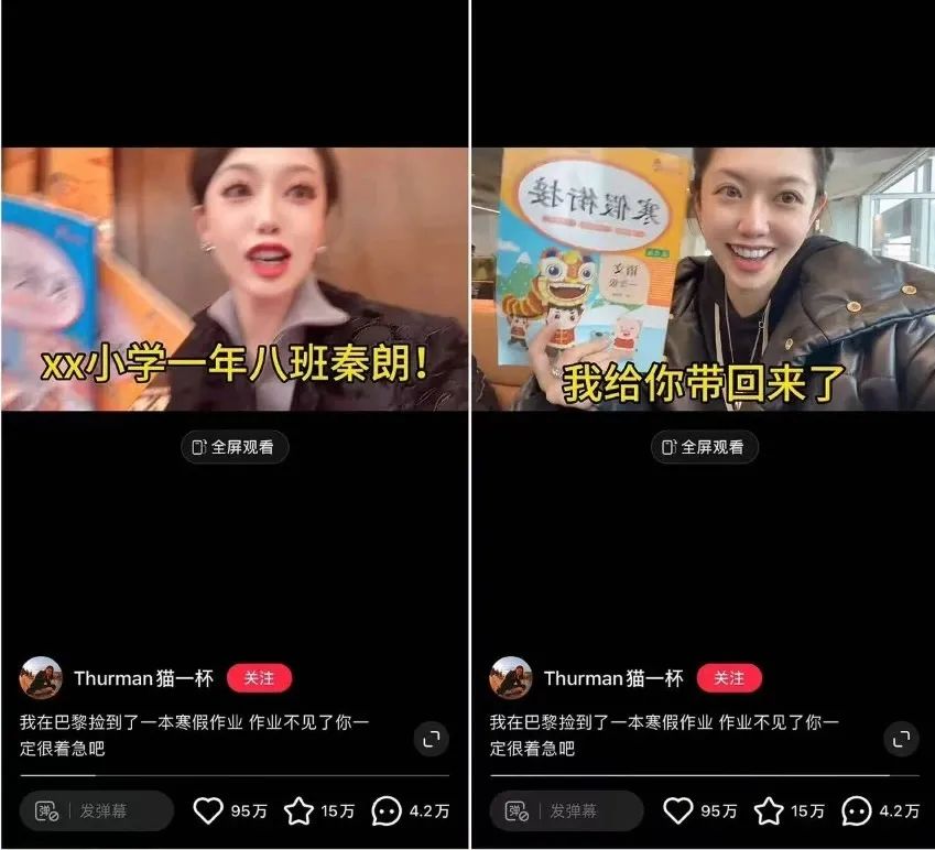 今天2月,猫一杯发布一条视频,称自己在巴黎街头收到了一个法国人递来的两本寒假作业本,请她帮忙还给失主。拿过作业本后,猫一杯顺手翻了两页,发现两本作业本一页没写,被遗失的原因似乎一目了然。一番打趣后,她在视频末尾举着作业本向其主人喊话:“XX小学一年八班秦朗,你的寒假作业放巴黎厕所忘拿啦。”