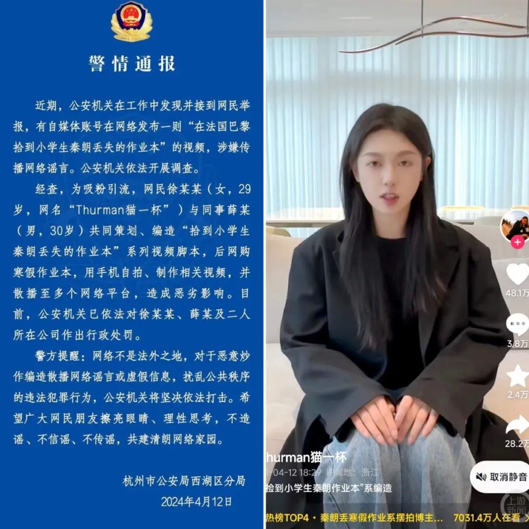 所谓的圆满显然只是另一个谎言。直到杭州西湖公安正式通报处罚后,猫一杯才终于发布视频道歉,称作业本事件从头到尾都只是一场精心策划,目的就是为了攫取短视频流量。