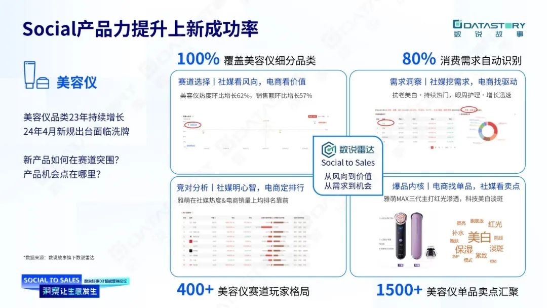 紧接着,数说故事将Social洞察和电商洞察结合起来,用Social看需求,看用户的使用效果,用电商去衡量销量,衡量渠道销售效果,这两套体系加在一起,构成了“数说雷达”产品力体系,指向的是品牌在某条赛道如何突围的问题。