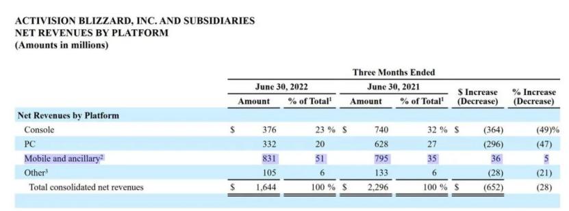 动视暴雪2022Q2财报,移动端收入达8.31亿美元,占据总收入一半以上,也是唯一实现同比增长的收入类型。